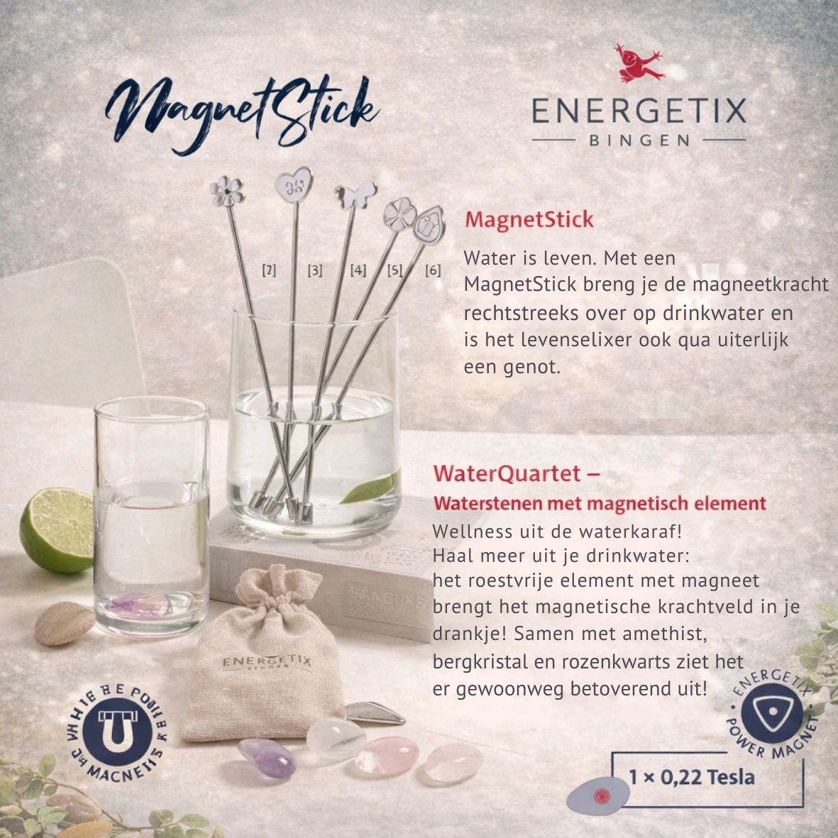 Water is het belangrijkste levensmiddel. Als we ons welzijn willen bevorderen, is het belangrijk voldoende water te drinken – minstens 1,5 tot 2 liter per dag. Echter het ene water is het andere niet, de kwaliteit is belangrijk. Met onze magnetische waterstaaf kunt u eenvoudig de kwaliteit verbeteren, simpel door onze magneetstaaf in uw glas water te zetten (na ca. 10 minuten is het water gemagnetiseerd.)