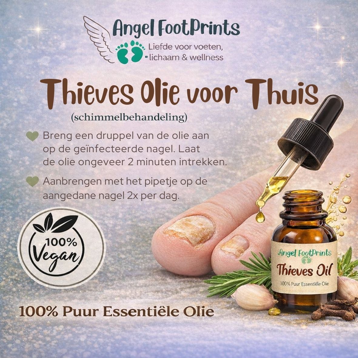 Een van de meest populaire mengsels ter ondersteuning bij de behandeling van teennagelschimmel is Thieves Oil. Deze krachtige combinatie is samengesteld uit de volgende essentiële oliën: argan, tea tree, kaneel, kruidnagel, pepermunt, citroen en rozemarijn. Elk van deze oliën staat bekend om zijn zuiverende, antibacteriële en schimmelwerende eigenschappen.