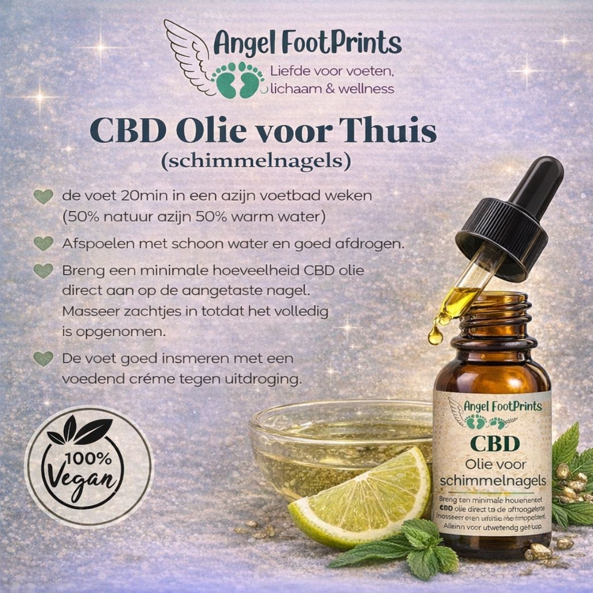 CBD-olie bij schimmelnagels (in combinatie met een azijn-voetenbad) is een natuurlijke verzorgingsroutine die helpt de nagels en huid rondom de nagel te ondersteunen. Het voetenbad met 50% azijn en 50% water reinigt en creëert een ongunstige omgeving voor schimmelgroei, terwijl CBD-olie de nagel en nagelriemen verzorgt, verzacht en helpt herstellen. Ideaal als aanvullende, dagelijkse verzorging voor gezonde en verzorgde nagels.