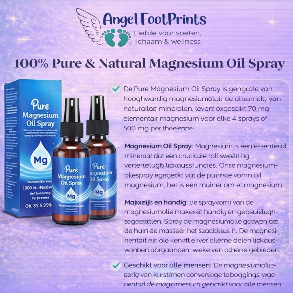 Pure Magnesium Oil Spray is een verfrissende en snel intrekkende spray die je huid voorziet van zuiver magnesium — een mineraal dat bekend staat om zijn bijdrage aan ontspanning en comfort. Je kunt de spray direct op huid aanbrengen om spieren en voeten een rustgevend gevoel te geven, vooral na inspanning of een lange dag staan. Ideaal voor dagelijkse verzorging en ondersteuning van je welzijn.