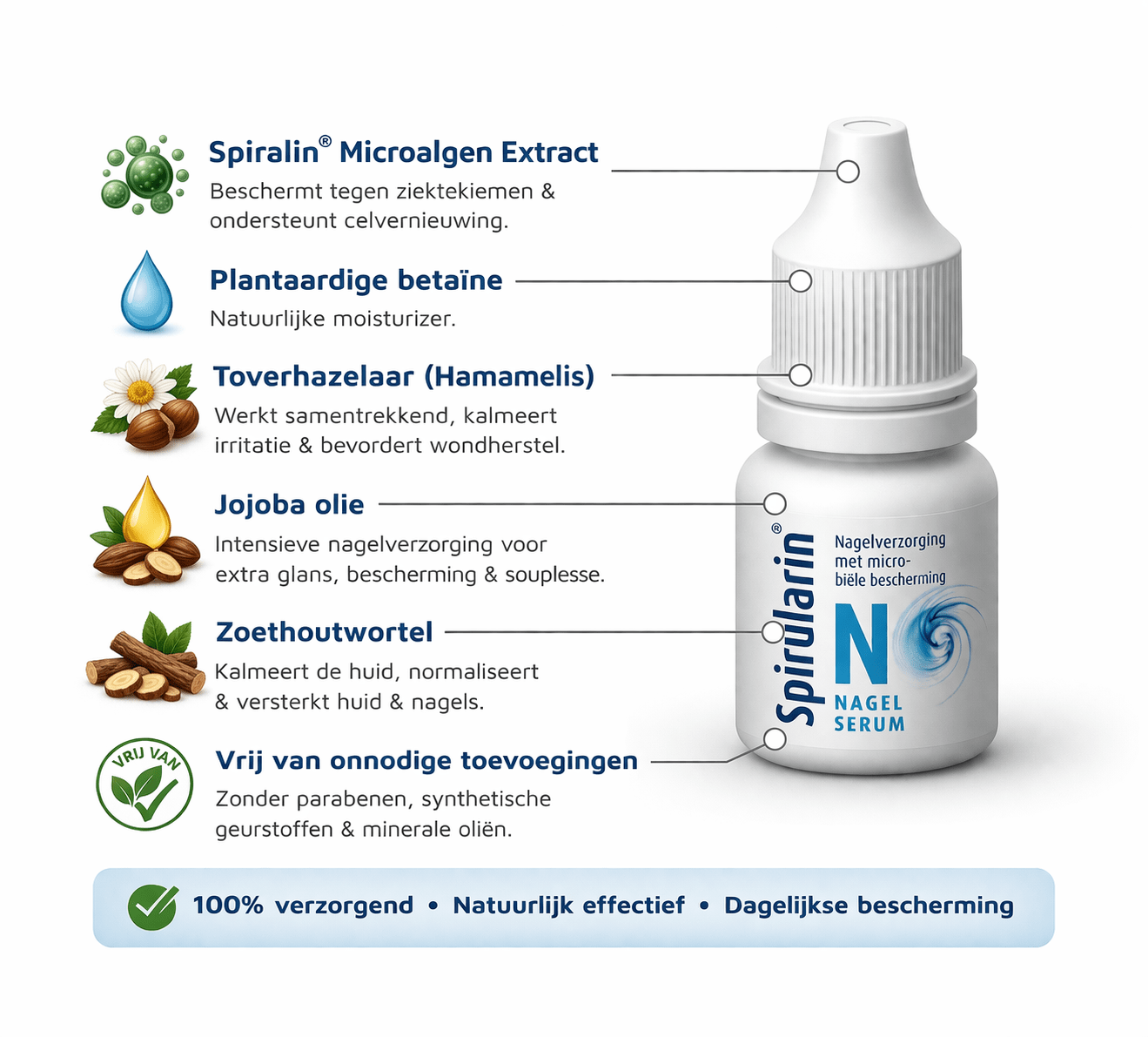- De tweede stap vindt thuis plaats met behulp van het Spirularin® N nagelserum.