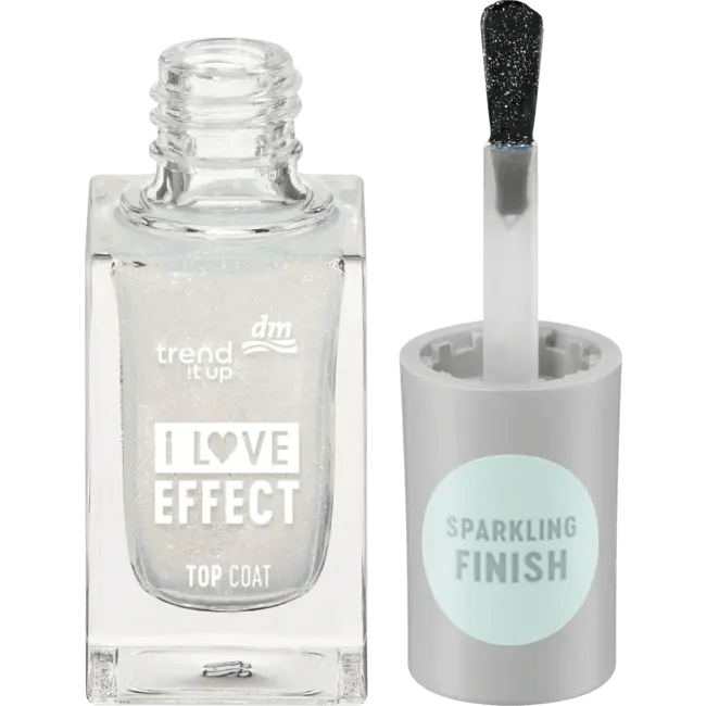 De I love Effect Top Coat 110 Sparkling Finish van trend!t up geeft iedere gekleurde lak een fantastische uitstraling. De topcoat kan de levensduur van de nagellak op de nagels verlengen en laat ook een prachtige sprankelende finish achter.